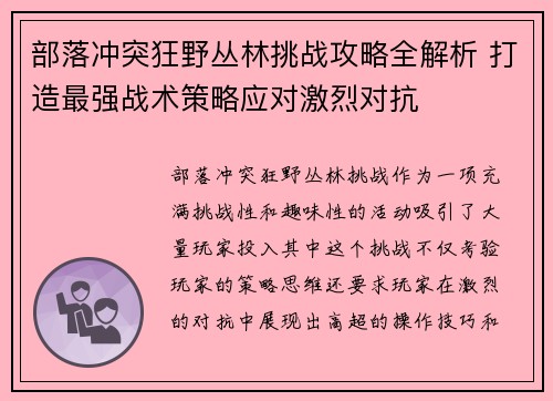 部落冲突狂野丛林挑战攻略全解析 打造最强战术策略应对激烈对抗
